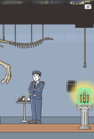 恐竜の化石の口の中にある鍵を手に入れ、右奥の扉に使い、ロッカーから警備服を手に入れて主人公に渡します。