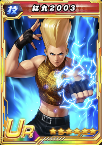 | パッシブスキル2 | 雷撃の光 敵全体の行動制限耐性を減少させる。敵単体が京かネスツスタイル京のやけどと紅丸2003の「静電」効果を同時に付与されたとき、本バトルでのダメージ減少率が15%減少する。紅丸2003自身にはマヒ効果と「静電」効果が無効である。 敵全体の行動制限無効率が7%減少する。(Lv:0.08%) |