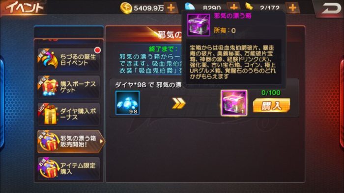 「邪気の漂う箱」が6/26より二日間、1個98ダイヤ(1日100個まで)で販売されています。
