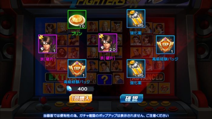 「氷の妖精」は1回400ダイヤで引くことができ、月末の限定ガチャとは違って6つのアイテムと、当たりの時だけ7つ目にキャラクターが出現します。(↓はネスツ京の復刻ガチャの画像です。)