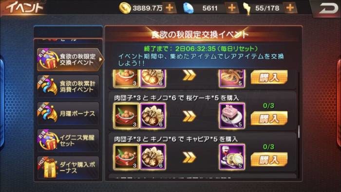 「食欲の秋イベント」は「肉団子」と「きのこ」を集めてアイテムと交換する毎月恒例の月初イベントです。