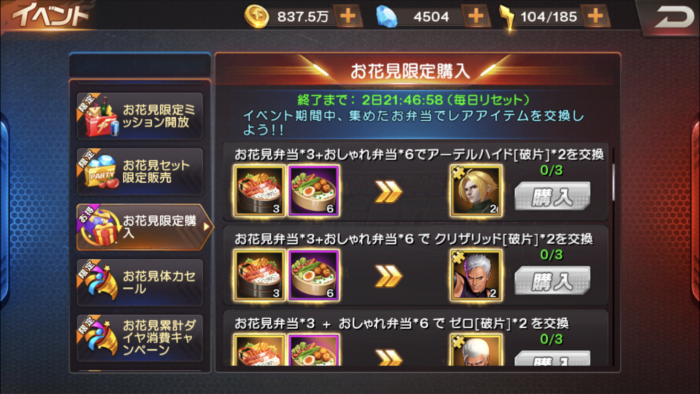 毎月恒例のアイテムを集めて欠片などと交換するイベントで、今回はおしゃれ弁当とお花見弁当を集めます。