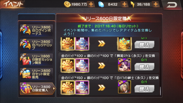 | 奥義石箱(極限)×1(2) | 金バッジ×30 銀バッジ×20 |