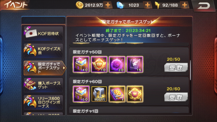 限定ガチャと併設で限定ガチャの回数に応じて、ST魂、極限奥義石、高級な紙切れ、マキの覚醒素材である美少女バッジと魔力攻略本などがもらえます。