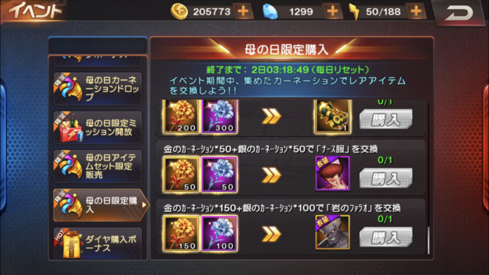 ログインボーナスは3日間で金のカーネーション4個、銀のカーネーション9個が手に入ります。