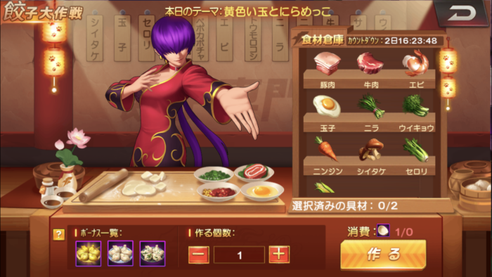 餃子の皮1つと食材を2つ選択して、出来上がった餃子から報酬のアイテムを獲得できます。
