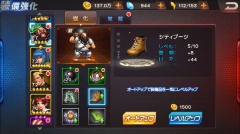 装備をレベルアップしていないキャラクターの装備のレベルを上げると、戦闘力を1単位で調整することが出来ます。