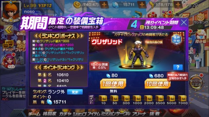 「キングオブファイターズ’98 アルティメットマッチ オンライン」(KOF’98 UM OL)で開催される期間限定の「クリザリッド」の限定ガチャについてまとめています。