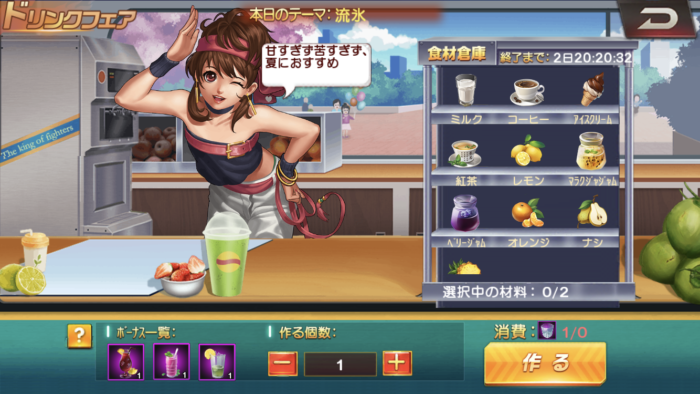 ドリンクフェアには日替わりのテーマがあり、テーマにあった食材を選ぶことでよりよい報酬を獲得できるドリンクが出来上がります。