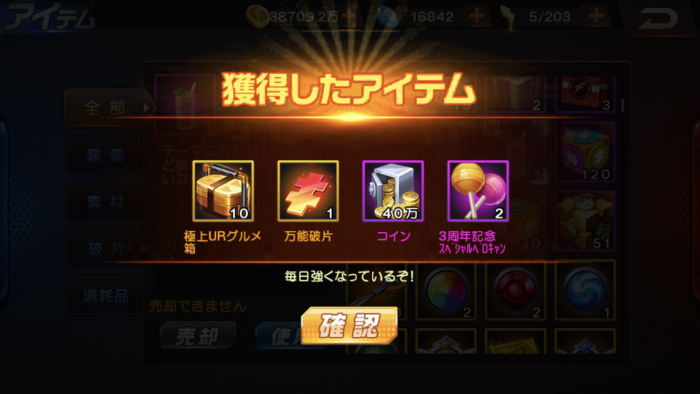 極上ドリンク、高級ドリンク、お手軽ドリンクをそれぞれ開けてみたところ、どのドリンクからも「3周年記念スペシャルペロキャン×2」(3周年の祝典ショップで使用するアイテム)が手に入ったので、3周年記念スペシャルペロキャンは確定している可能性があります。
