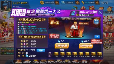 前回の暴走庵では限定の装備宝箱ガチャでしたが、ギースの限定ガチャは奥義石ガチャとなります。