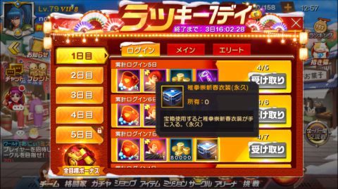 イベント期間7日間のログインで拳崇の新衣装、正月限定がもらえるので毎日欠かさずログインしましょう!