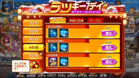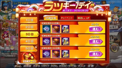 3日目は「試練宝箱」、「Ptイベント」、「闘志Lv UP」です。
