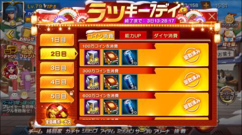 2日目は「コイン消費」、「能力UP」、「ダイヤ消費」です。