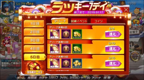 5日目は「アリーナ」、「試練イベント」、「コイン」です。