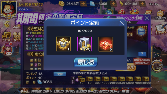 5000ポイントと7000ポイントのポイント宝箱からは禍忌の装備覚醒素材である「テコンドー攻略本」と「疾風バッジ」がもらえます。