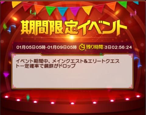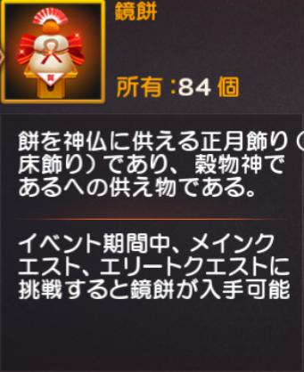 1/9(月)5:00までの期間、メインクエストとエリートクエストでドロップする「鏡餅」はダイヤを追加してアイテムと交換することが出来ます。