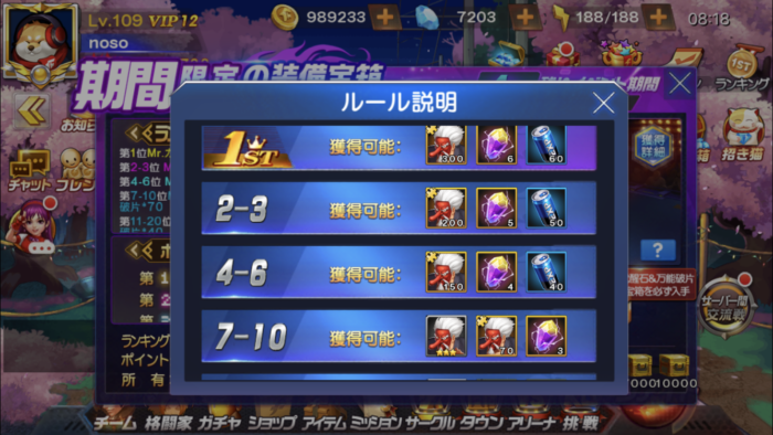 | 7~10位 | Mr.カラテ(星3本体)×1 / Mr.カラテの破片×70 / 覚醒石×3 |