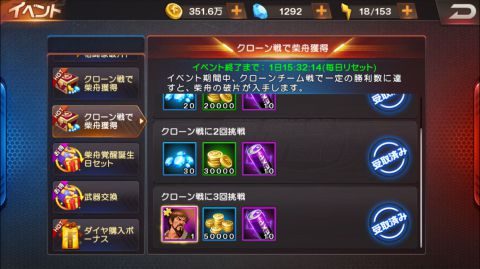 また、クローン戦を1日3戦することでダイヤや柴舟の破片がもらえます。