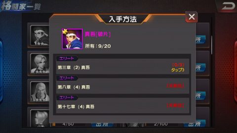 また、ホーム画面下の格闘家の画面では、そのキャラクターの破片の入手場所が分かるので活用しましょう!