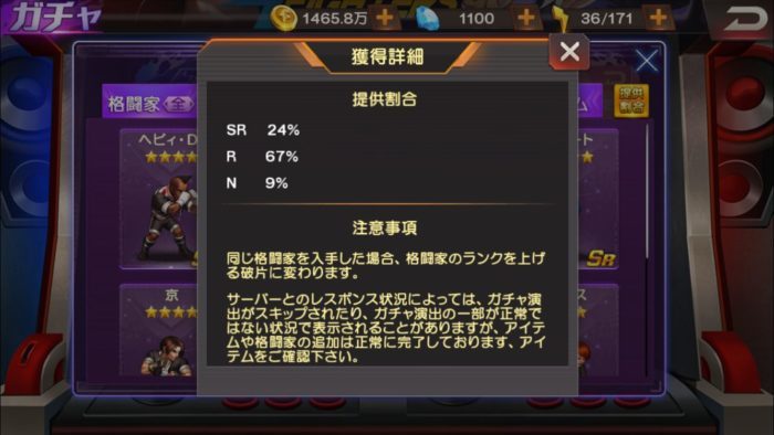管理人はリリース当初からKOF98UMOLをプレイしていますが、ダイヤガチャ、装備覚醒宝箱ともに体感では近しい出現率になっていると思います。