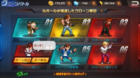 6体のクローンから挑戦する相手を選び、「チーム設立」で他のプレイヤーを募集するか「すぐ参加」で他のプレイヤーとチームを作ります。