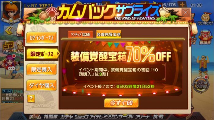 装備覚醒宝箱の毎日初回10連が70%OFFになります。