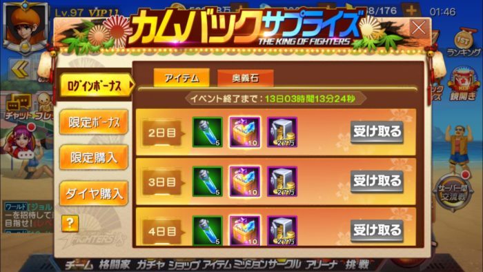 | 2日目 | 古い宝石箱×50 / 50000コイン / ダイヤ奥義石宝箱 |