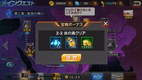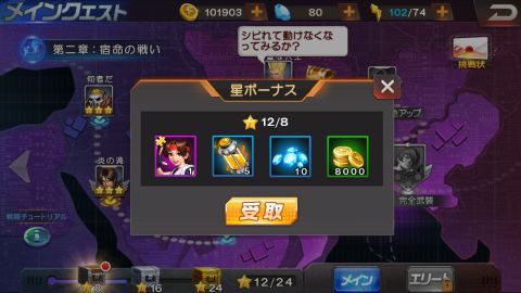 また章毎にクエスト評価の星を集めることで、画面下の宝箱から「星ボーナス」として「ダイヤ」がもらえます。