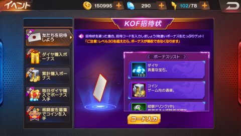 他のプレイヤーの招待コードを入力することで「ダイヤ」をもらうことが出来ます。