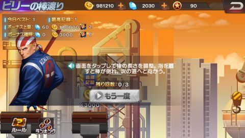 ビリーの綱渡りで渡った距離に応じて「ダイヤ」をもらうことが出来、1日で最大60個の「ダイヤ」がもらえます。