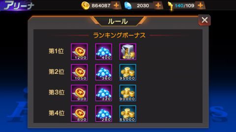 アリーナの最高順位で「ボーナス」から「ダイヤ」をもらうことが出来ます。