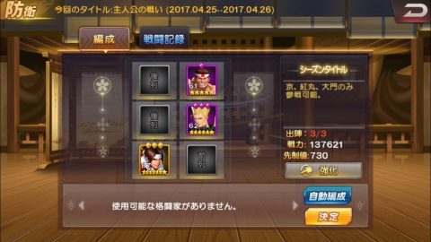 シリーズにより編成できるキャラクターに制限が設けられ、4/25の初開催では「京」、「紅丸」、「大門」のみ参加可能となっていました。
