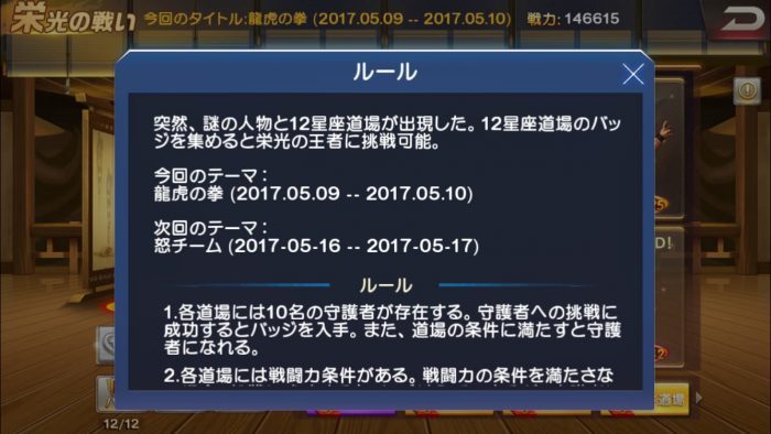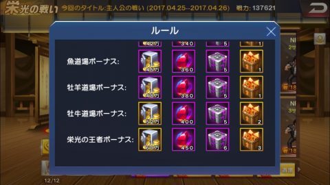 シーズン終了の段階で各道場の守護者か栄光の王者になっていた場合は、コイン、奥義秘薬、SR格闘家破片宝箱、奥義石箱がもらえます。