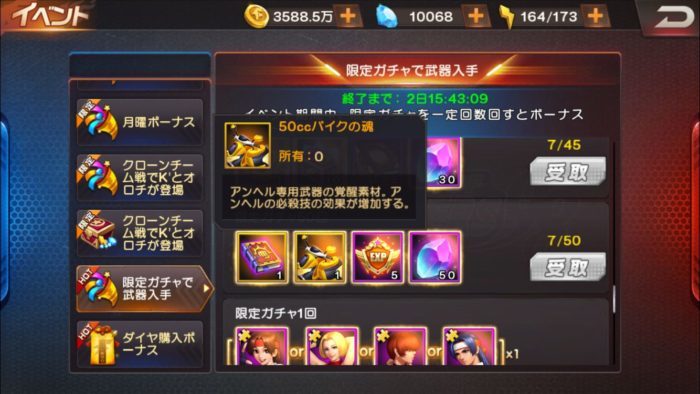限定ガチャ45回で「烈火バッジの魂」、50回で「格闘攻略本の魂」と「50㏄バイクの魂」となっているので、K’やアンヘルを強化したい人は確認しておきましょう。