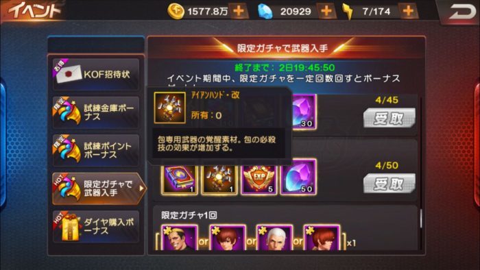 限定ガチャ45回で「オロチバッジの魂」、50回で「烈火攻略本の魂」と「アイアンハンド・改」となっているので、暴走庵や包を強化したい人は確認しておきましょう。