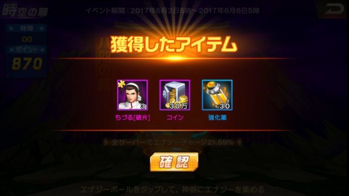 サーバー全体報酬は最大で『「14万コイン」、「闘志秘薬×100」、「覚醒石×1」、「万能破片宝箱×6」』がもらえます。