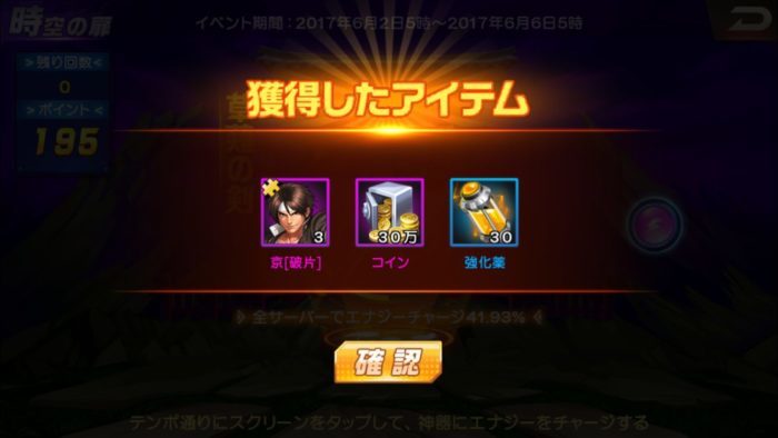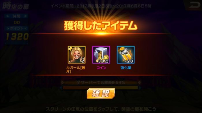サーバー全体報酬は最大で『「14万コイン」、「奥義秘薬×200」、「特級経験バッジ×2」、「万能破片宝箱×6」』がもらえます。