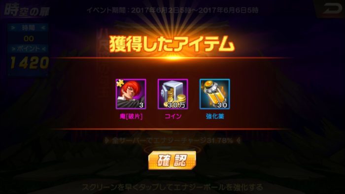 サーバー全体報酬は最大で『「14万コイン」、「古い宝石箱×20」、「闘志秘薬×50」、「万能破片宝箱×6」』がもらえます。