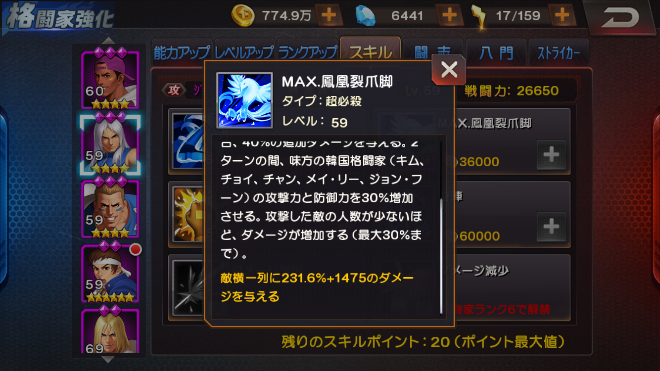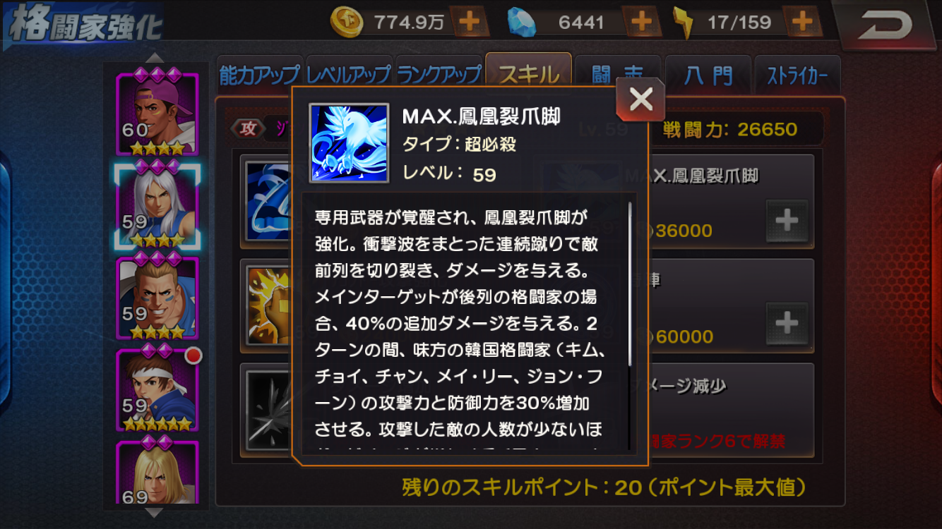 | MAX.鳳凰裂爪脚(武器覚醒) 専用武器が覚醒され、鳳凰裂爪脚が強化。衝撃波をまとった連続蹴りで敵横一列を切り裂き、ダメージを与える。メインターゲットが後列の格闘家の場合、40%の追加ダメージを与える。2ターンの間、味方の韓国格闘家(キム、チャン、メイ・リー、ジョン・フーン)の攻撃力と防御力を30%増加させる。攻撃した敵の人数が少ないほどダメージが増加する(最大30%まで)。 敵横一列に230%+25のダメージ(Lv:0.2% / +25) | |