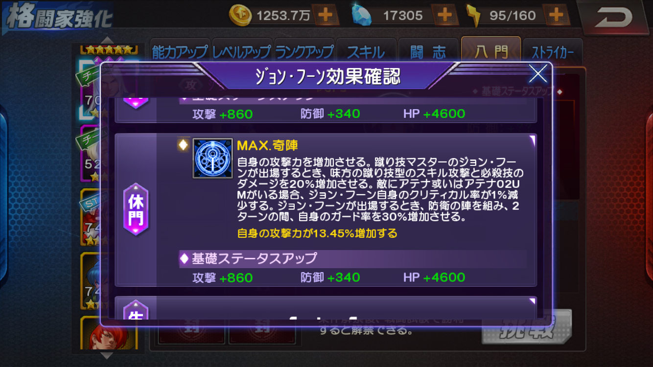 | パッシブスキル2 | 奇陣 自身の攻撃力を増加させる。蹴り技マスターのジョン・フーンが出場するとき、味方の蹴り技型のスキル攻撃と必殺技のダメージを15%増加させる。敵にアテナあるいはアテナ02UMがいる場合、ジョン・フーンのクリティカル率が1%減少する。 自身の攻撃力が5%増加する(Lv:0.05%) |