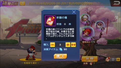 この記事では「キングオブファイターズ’98 アルティメットマッチ オンライン」(KOF’98 UM OL)の「祈願の樹」でもらえるアイテム(キャラの破片、グルメ)や必要なダイヤについて紹介しています。