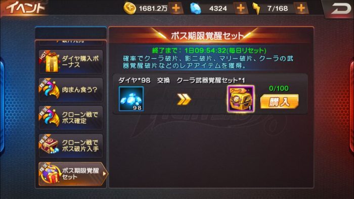 クーラ覚醒セットとK’覚醒セットはイベント画面の「ボス期限覚醒セット」でダイヤ98個で販売されており、1日100個まで購入可能です。