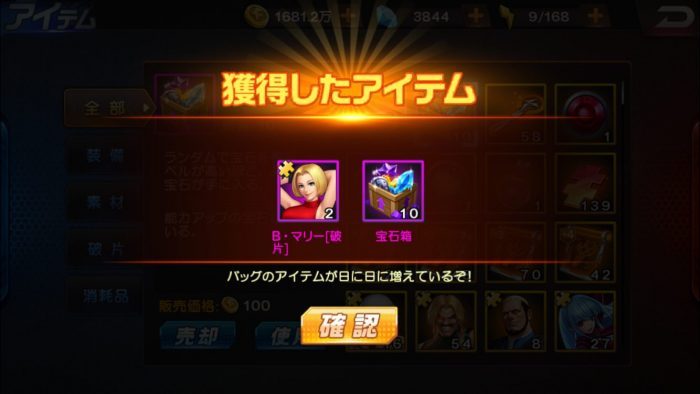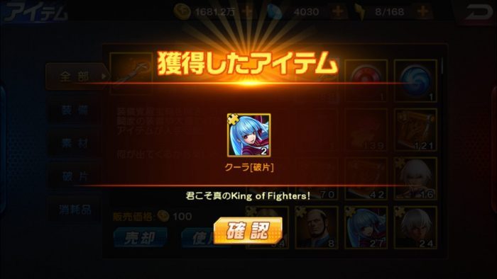 K’覚醒セットからは「K’の破片」、「テリーの破片」、「クラークの破片」、K’の武器覚醒素材「制御用グローブ・改の破片」などのアイテムが出現します。