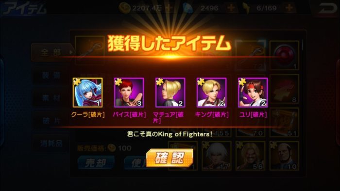 手に入れた女性格闘家破片宝箱をクーラの破片に期待しつつ開けるとクーラの破片は1個だけ手に入りました。