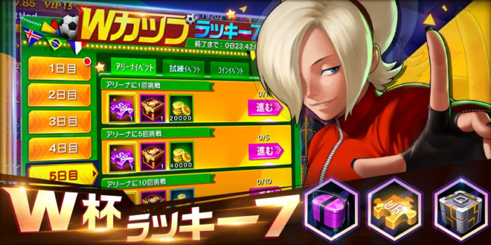 「キングオブファイターズ’98 アルティメットマッチ オンライン」(KOF’98 UM OL)の「ワールドカップラッキー7デイ」の情報をまとめています。