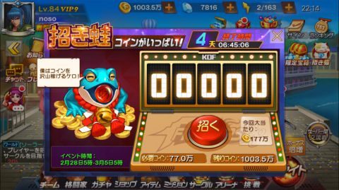 この記事では「キングオブファイターズ’98 アルティメットマッチ オンライン」(KOF’98 UM OL)で新たに開催された「招き蛙」で必要なコインと大当たりのコインをまとめています。