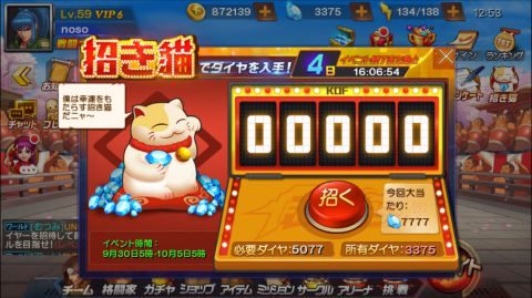 「招き猫」では「必要ダイヤ」を使って招くと、必要ダイヤ以上、大当たりのダイヤ以下のダイヤをもらうことができます!