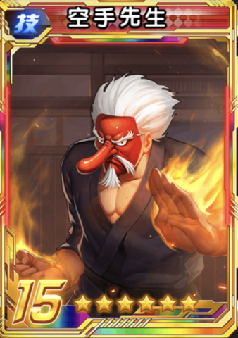 味方の極限流格闘家の必殺技ダメージを増加させる(タクマのパッシブとは重複不可)。致死ダメージを受けても死亡せず、「戦鬼」効果(1ターンの間、致死ダメージを3回耐える。1回のバトルで1回のみ発動可能)が発動し、次のターンの開始時に自身の全ての状態異常を回復し、怒りを600回復する。ターンの開始時に、自身の吸収率をとクリティカル率が25%増加させる。自身のHPが低いほど、増加量が多くなる(最大で60%まで)。Mr.カラテの登場時、2ターンの間、攻撃タイプの敵格闘家のクリティカルダメージを20%減少させる。「戦鬼」効果が発動すると、即座に最大HPの30%を回復する。