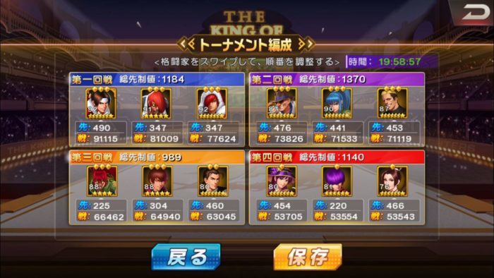 KOF大会サーバー戦では試合は3対3のタイマン戦でより原作に近い戦い方ですが、編成のみ自分で行い、戦闘中は操作することができません。